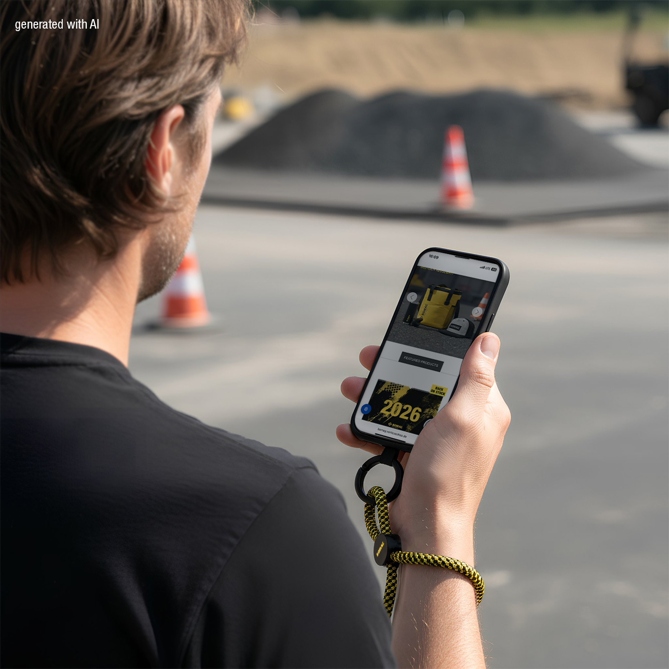 Details: Round woven 2-color key ring, metal buckle with BOMAG logo, incl. universal holder for smartphones, robust round key ring